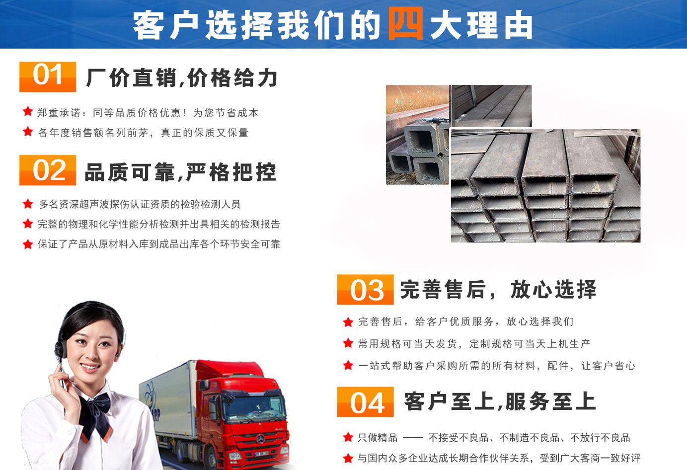 無錫盛灝特鋼有限公司長期銷售Q355B方矩管,鍍鋅方矩管,大口徑方矩管,厚壁方矩管,無縫方矩管等各種方管產品!產品廣泛應用于鋼結構建筑(鋼管混凝土、管樁、管桁架,橋梁、海上作業平臺、港口碼頭建設、電視通訊鐵塔、電力鐵塔等鋼結構管)。壓力管道(石油、天然氣、煤漿等輸送)、機械制輥等領域?! 」咀詣撧k以來,一直堅持“誠信合作,共同發展”的經營理念。 一直以來我們本著“以誠相待,以信為本,互利互惠,共同發展”的長期方針,充分發揮現貨資源優勢為您提供“可靠的產品、過硬的質量、完善的服務”,歡迎廣大新老客戶前來洽談業務。 公司以“至誠至信,雙利雙贏”為根本宗旨,堅持科技興企的發展策略,恪守商規,創新進去,贏得聲譽,贏得了市場,得到了社會各階層的認可。公司以雄厚的實力、可靠的質量、儲存鋼管門類齊全、庫存量大之優勢,本著守法、守信、創新的理念,打造精品,發展鋼管多元化品種,滿足客戶各種需求,以低廉的價格、熱情的服務面向國內外客戶,歡迎鋼管界同仁加盟!我們為客戶提供周到的服務 ! 公司為客戶提供以下服務 服務三保: 保證質量、保證時間、保證數量?! 》兆谥迹?雄厚的實力、優質的產品、低廉的價格、周到的服務?! ∨慵鏍I,一支起定。...